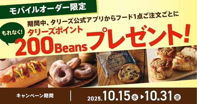 【10/15~】公式アプリモバイルオーダー限定フードをご注文で200Beansプレゼント!
