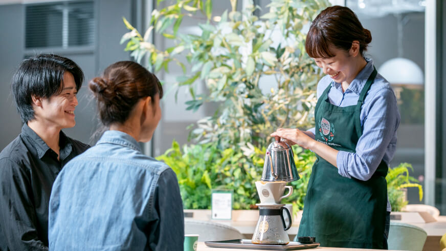 コーヒーのプロフェッショナルとして「コーヒーアドバイザー」と「コーヒーマスター」は、お客様一人ひとりの好みやシーンに寄り添い、最適な豆選びや楽しみ方を提案するとともに、確かな知識と経験をもとにコーヒーの奥深い魅力を伝えています。また、店舗ではコーヒースクールの講師として、コーヒーを通じた対話と学びの場を創出しています。