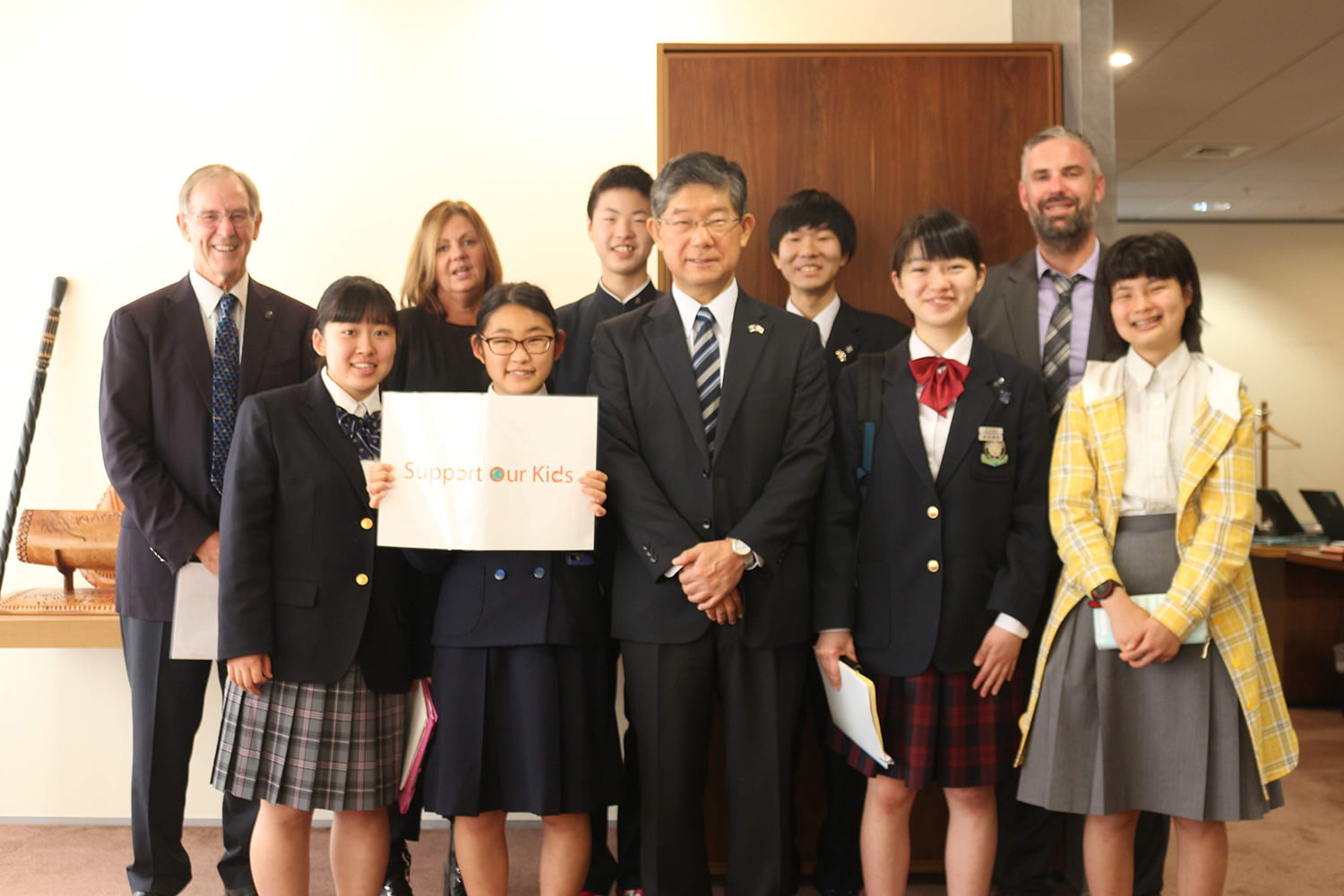 Support Our Kids名誉会長とベアフルを手に写真撮影