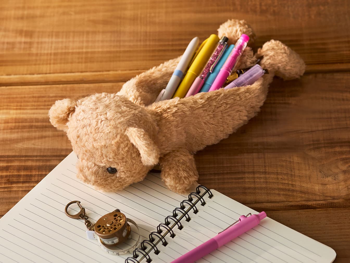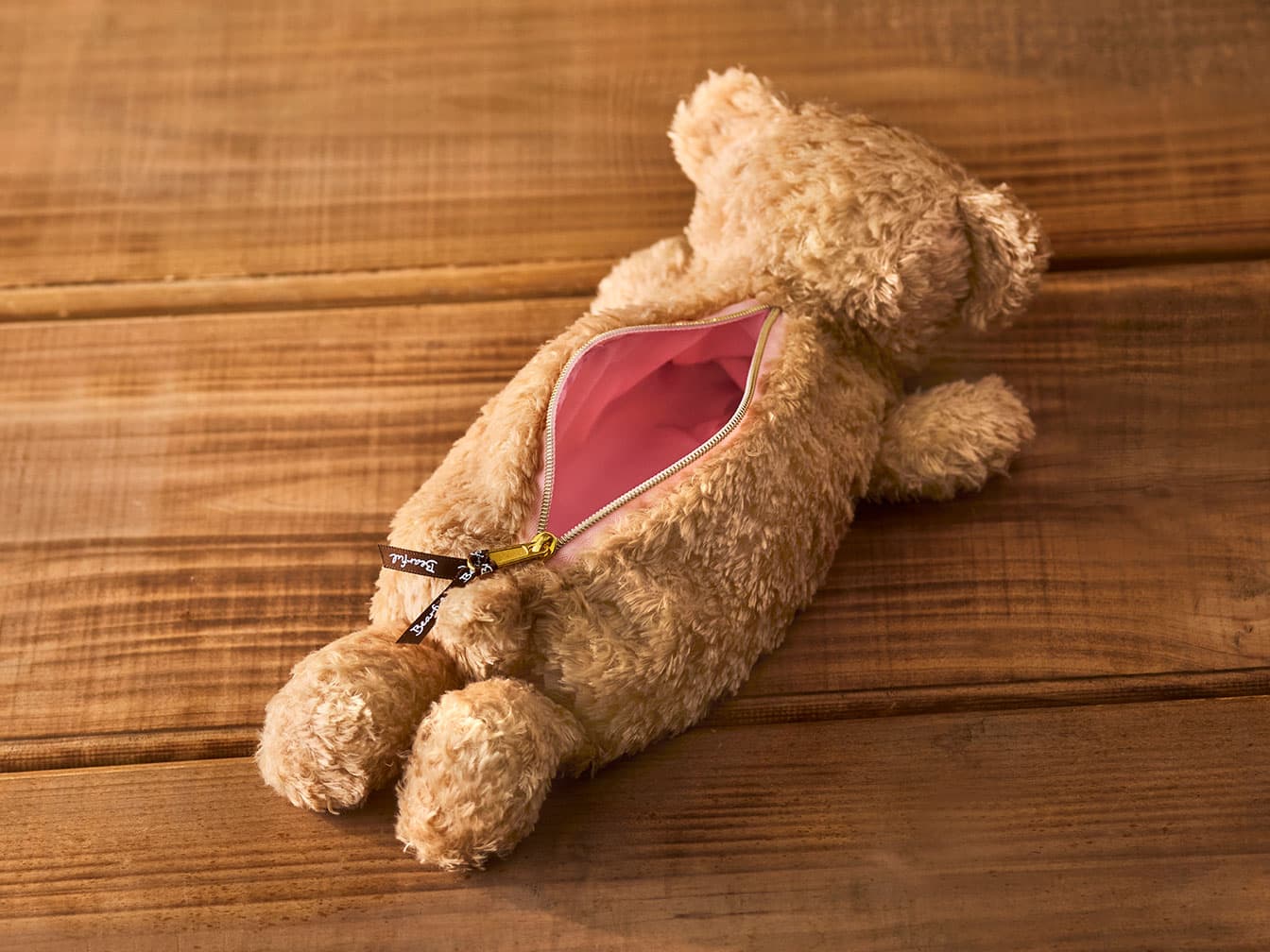 ベアフルのぬいぐるみポーチ。ペンケースとしてはもちろん、チェーンが付いているのでカバンにもつけることもできます。