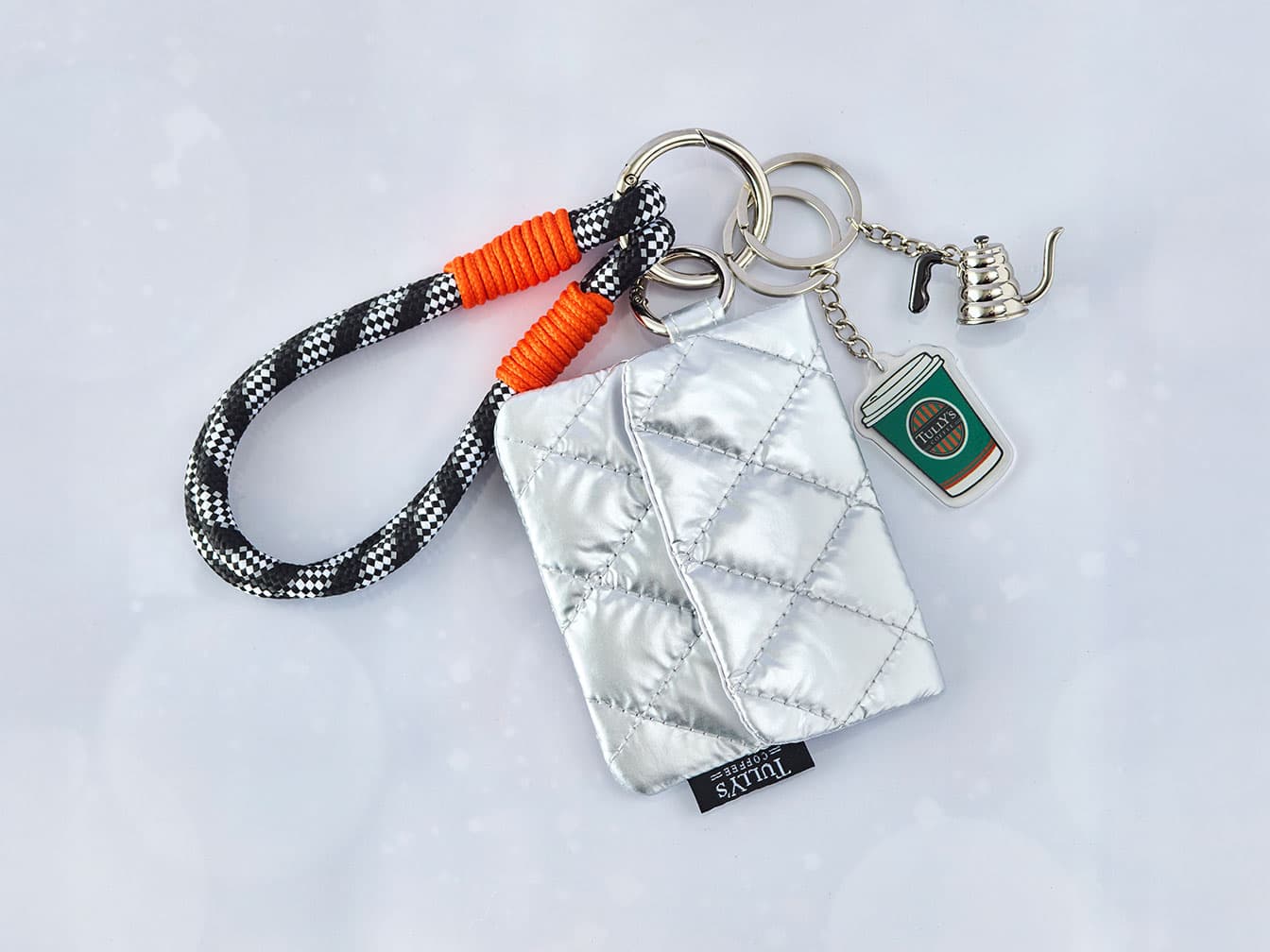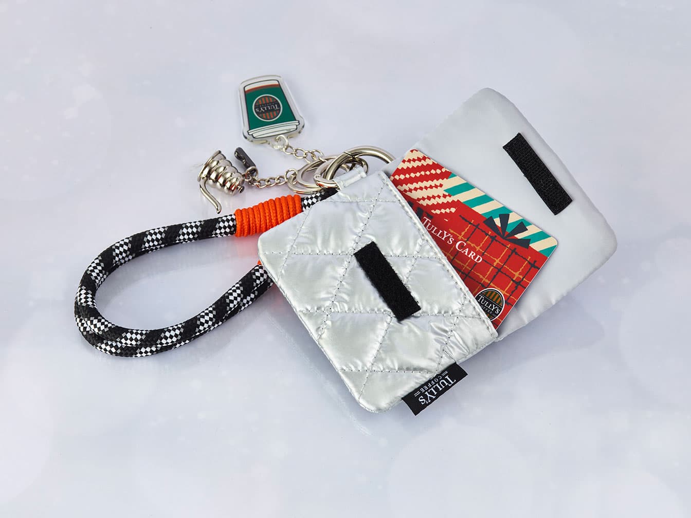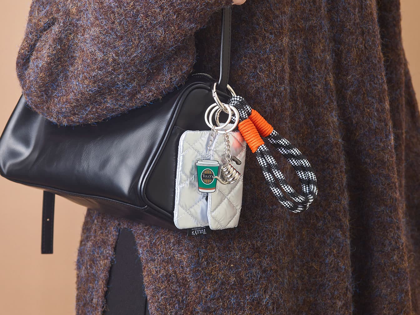 カラビナ付きのストラップにカードサイズのポーチやアクリルチャーム、コーヒー器具のチャーム(ケトル/ドリッパー/ポーターフィルターいずれか1個)を組み合わせました。