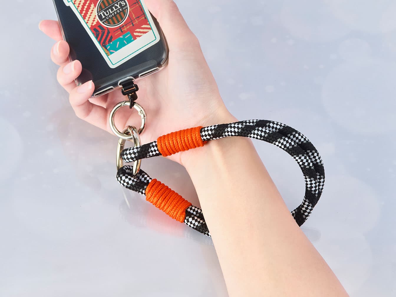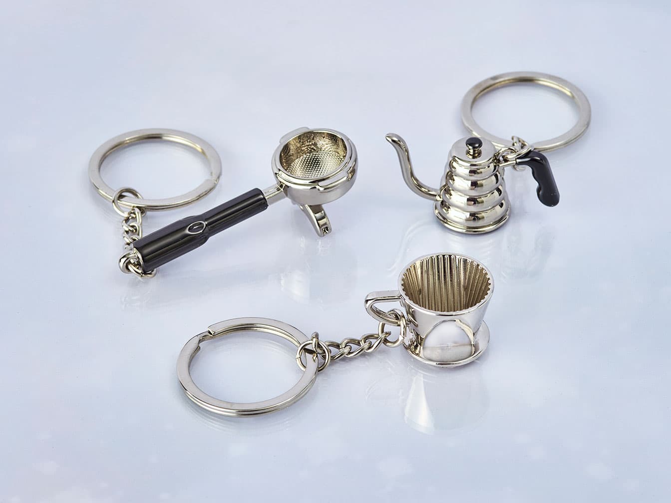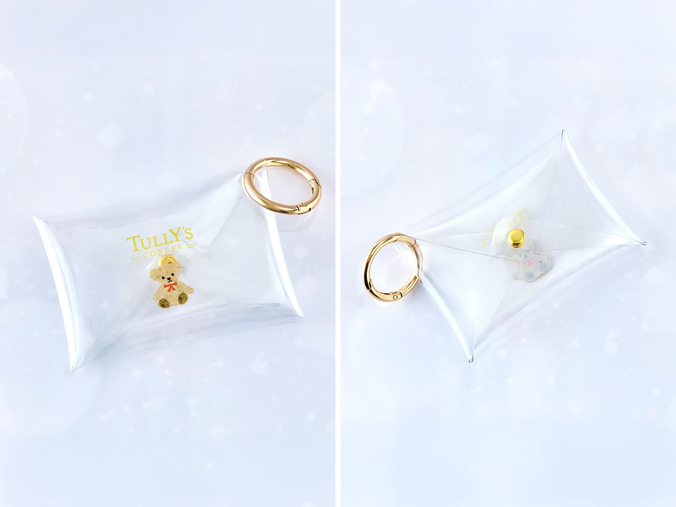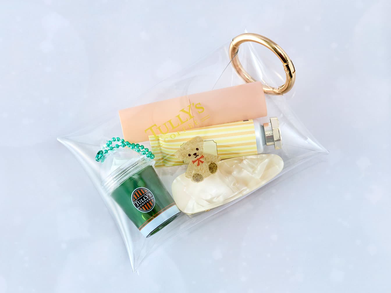 カラビナ付きのストラップにカードサイズのポーチやアクリルチャーム、コーヒー器具のチャーム(ケトル/ドリッパー/ポーターフィルターいずれか1個)を組み合わせました。