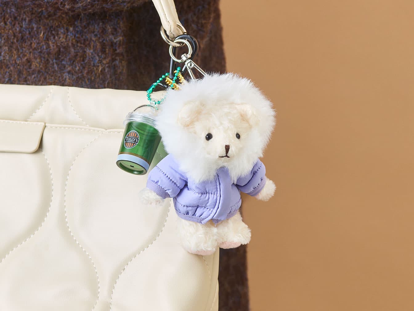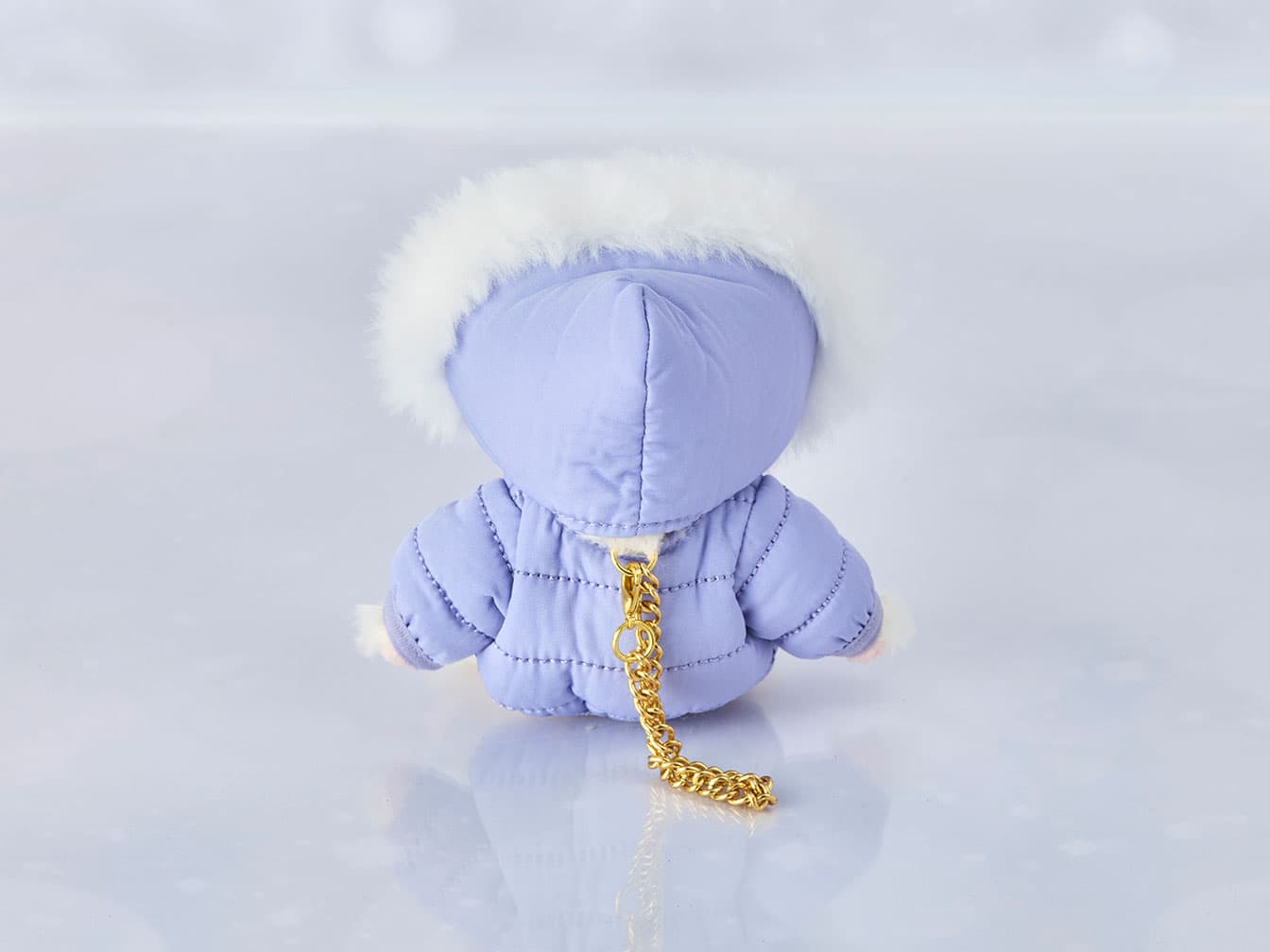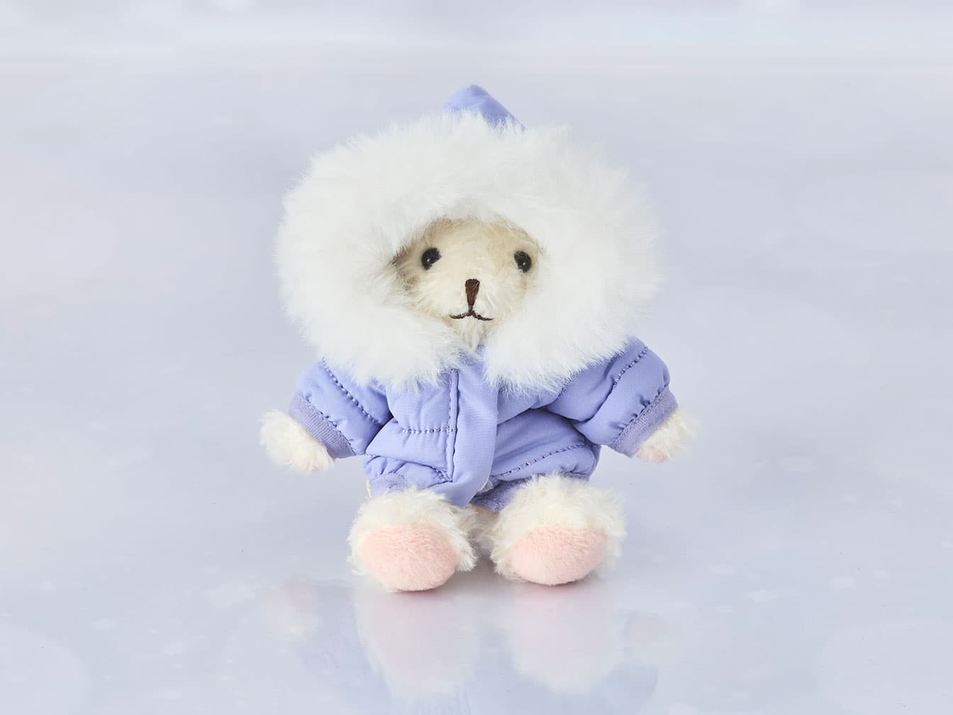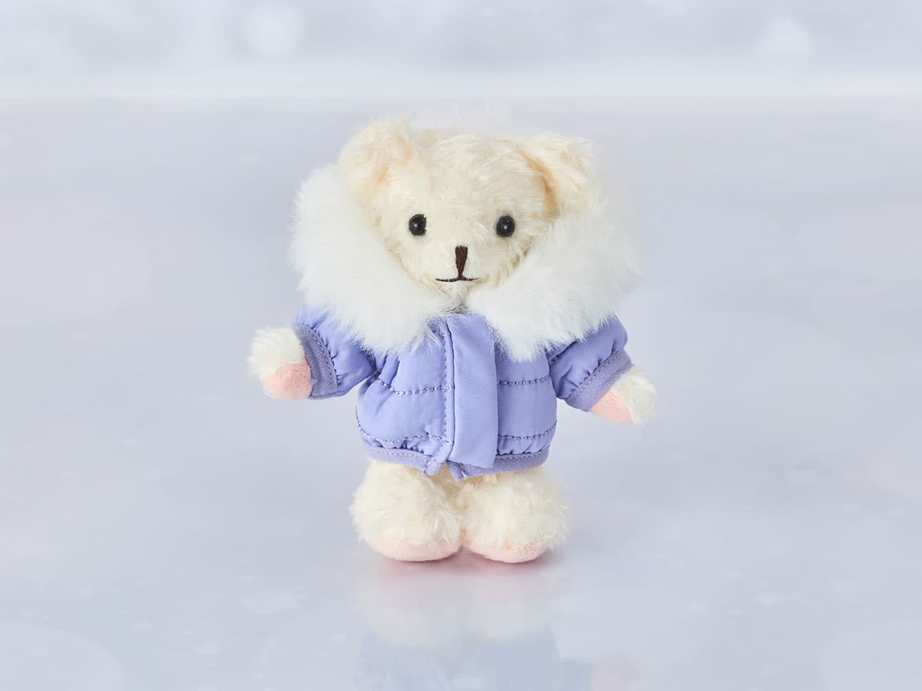 ラベンダーカラーのダウンジャケットを着た、冬の装いのベアフルです。ダウンジャケットは着脱することもできます。