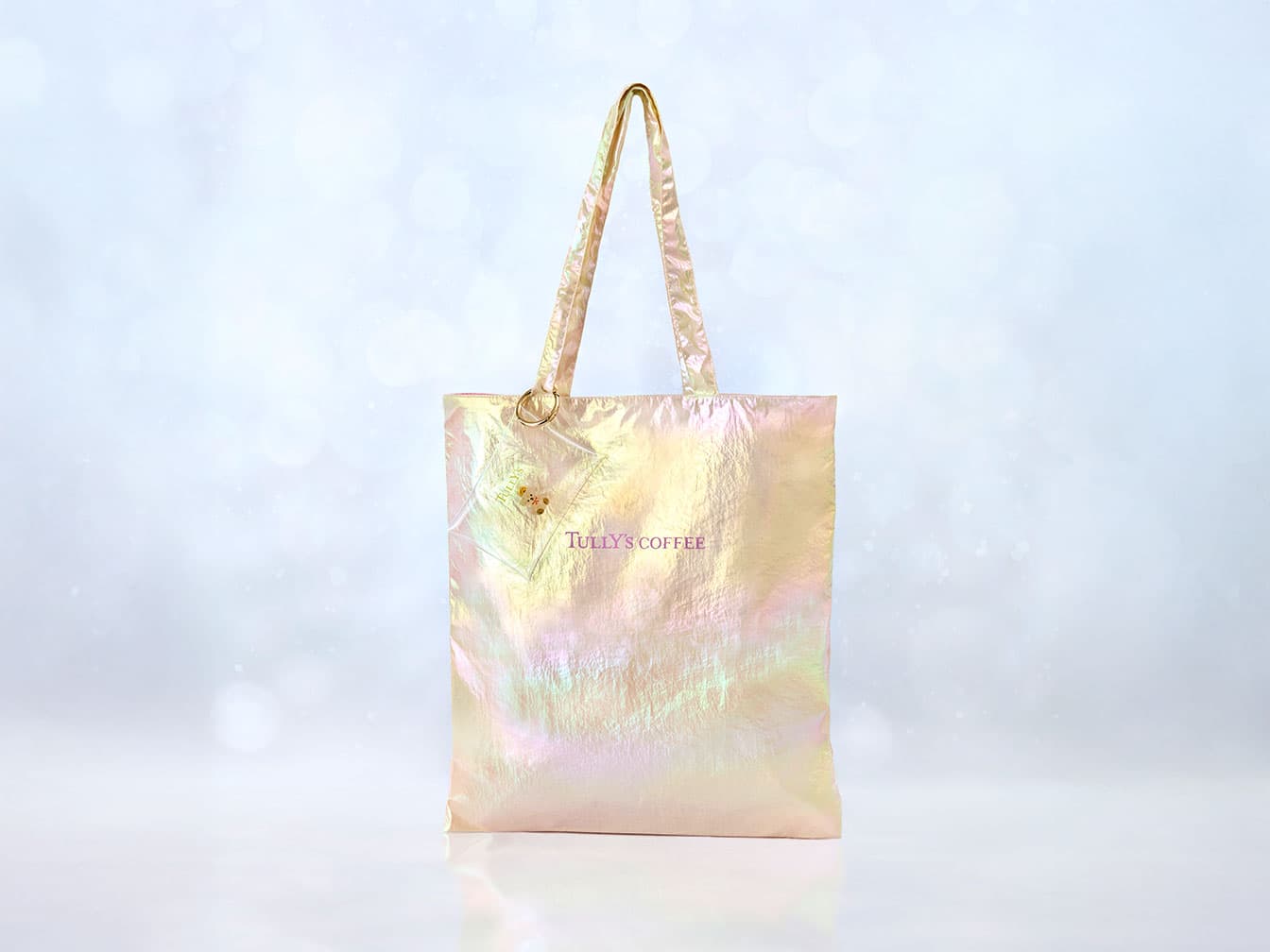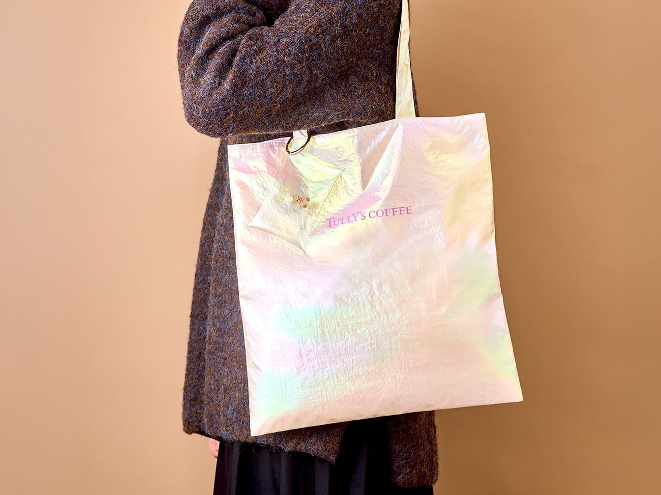 オーロラカラーに輝くトートバッグとクリアポーチのセット。ポーチにバッグを収納することができ、持ち運びにも便利です。