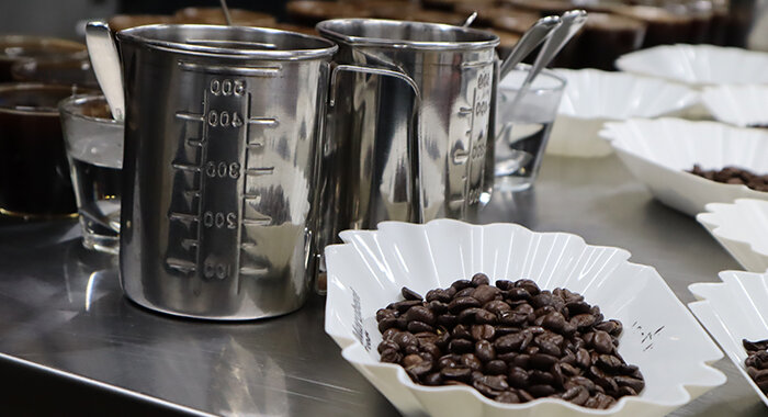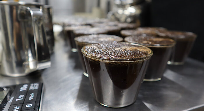 カッピングとは、コーヒーの香りや味わいを確かめ、その個性や品質を見極めるためのテイスティングのこと。粗く挽いたコーヒー豆にお湯を注ぎ、立ち上る香りや味わいを丁寧に見極めていきます。